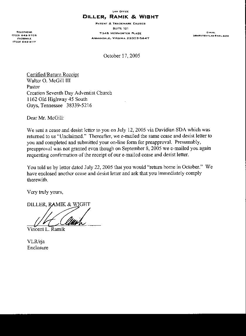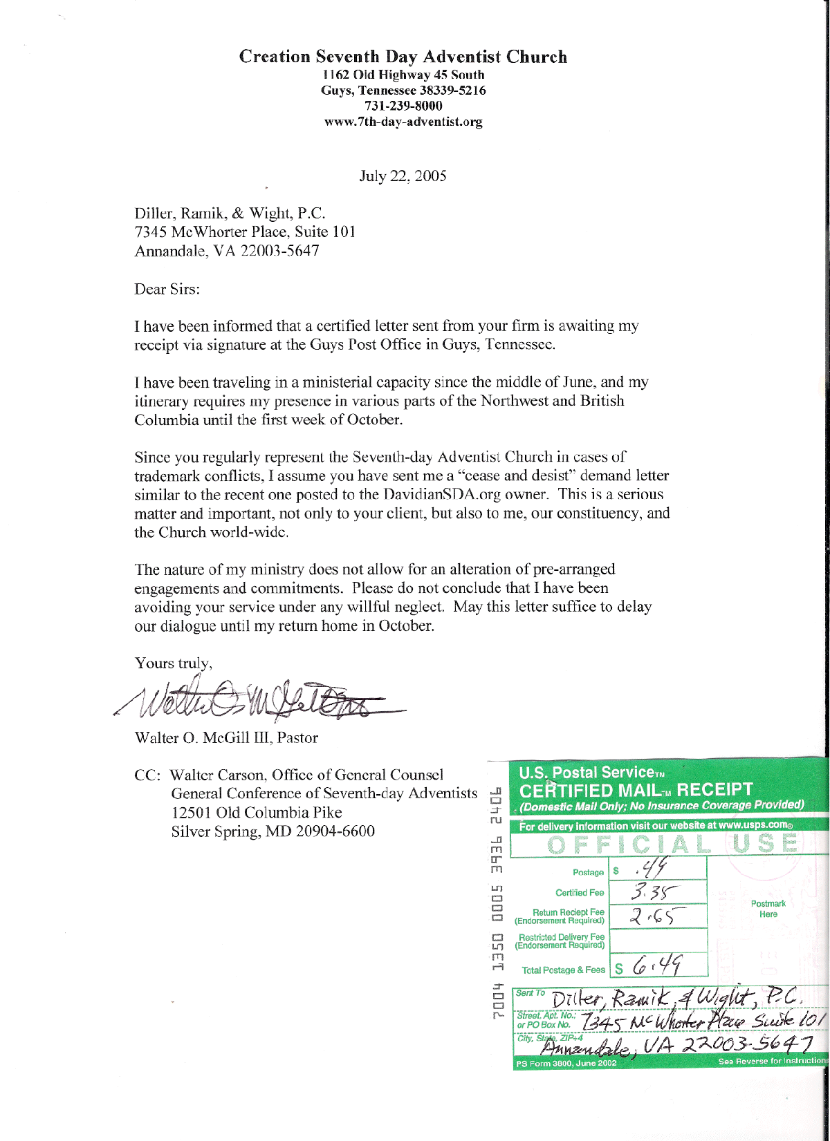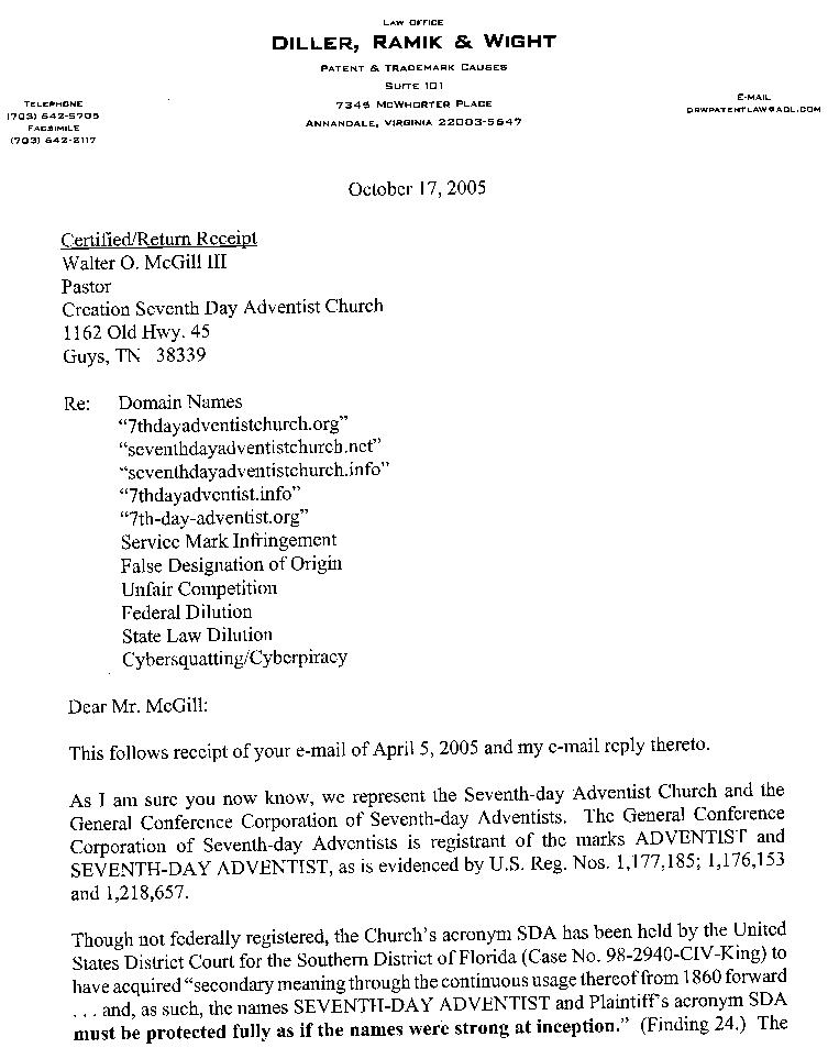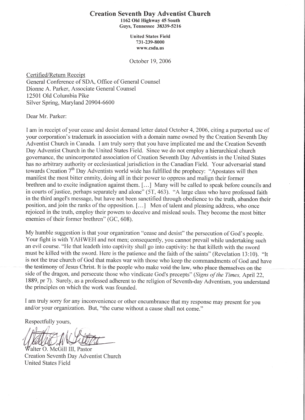 Actualizacion 07/22/05: Al Pastor Walter “Chick” McGill ha hecho una carta a la firma de abogados de la Conferencia General que esta imponiendo la Marca Registrada, pidiéndoles que entiendan por la demora que ha tenido en contestar su carta demanda, ya que el esta presentemente en una misión evangelistica. La Carta puede leerse AQUÍ