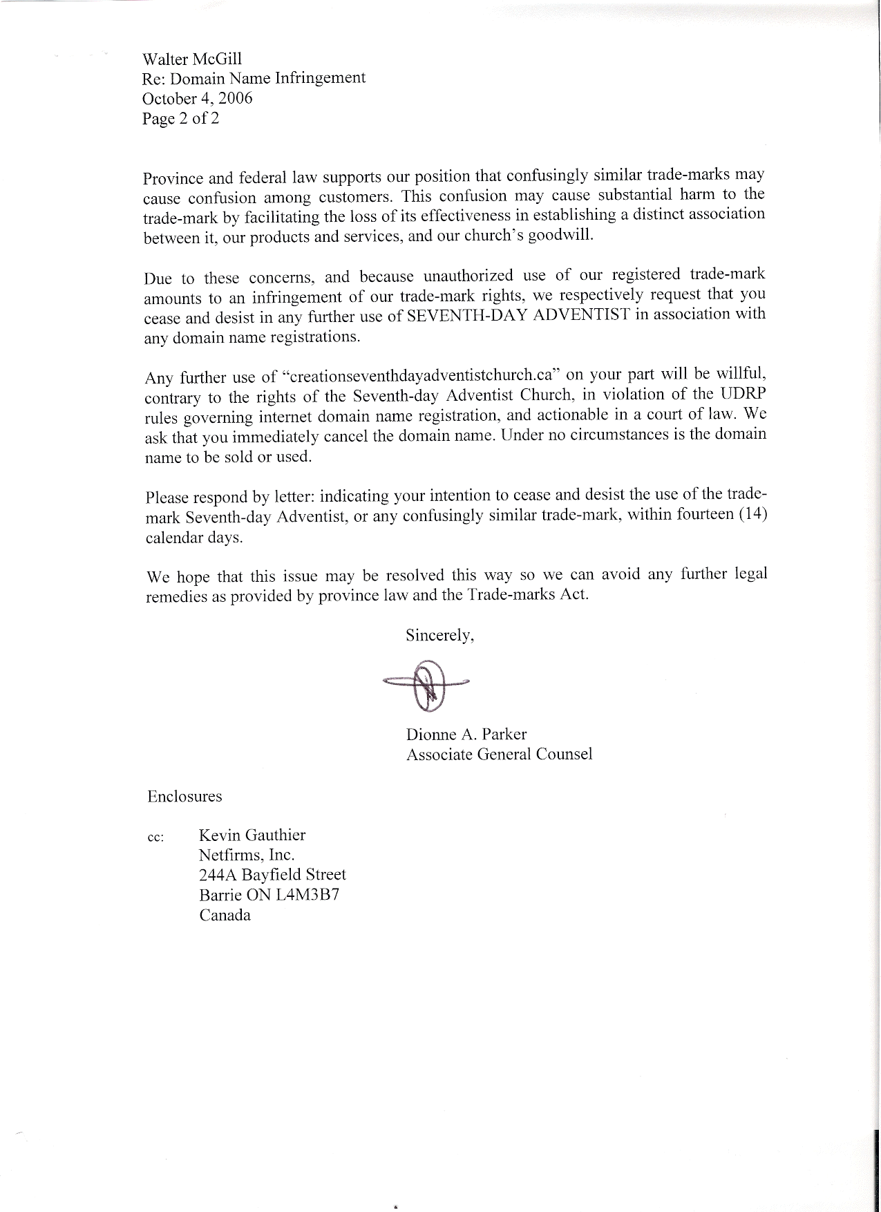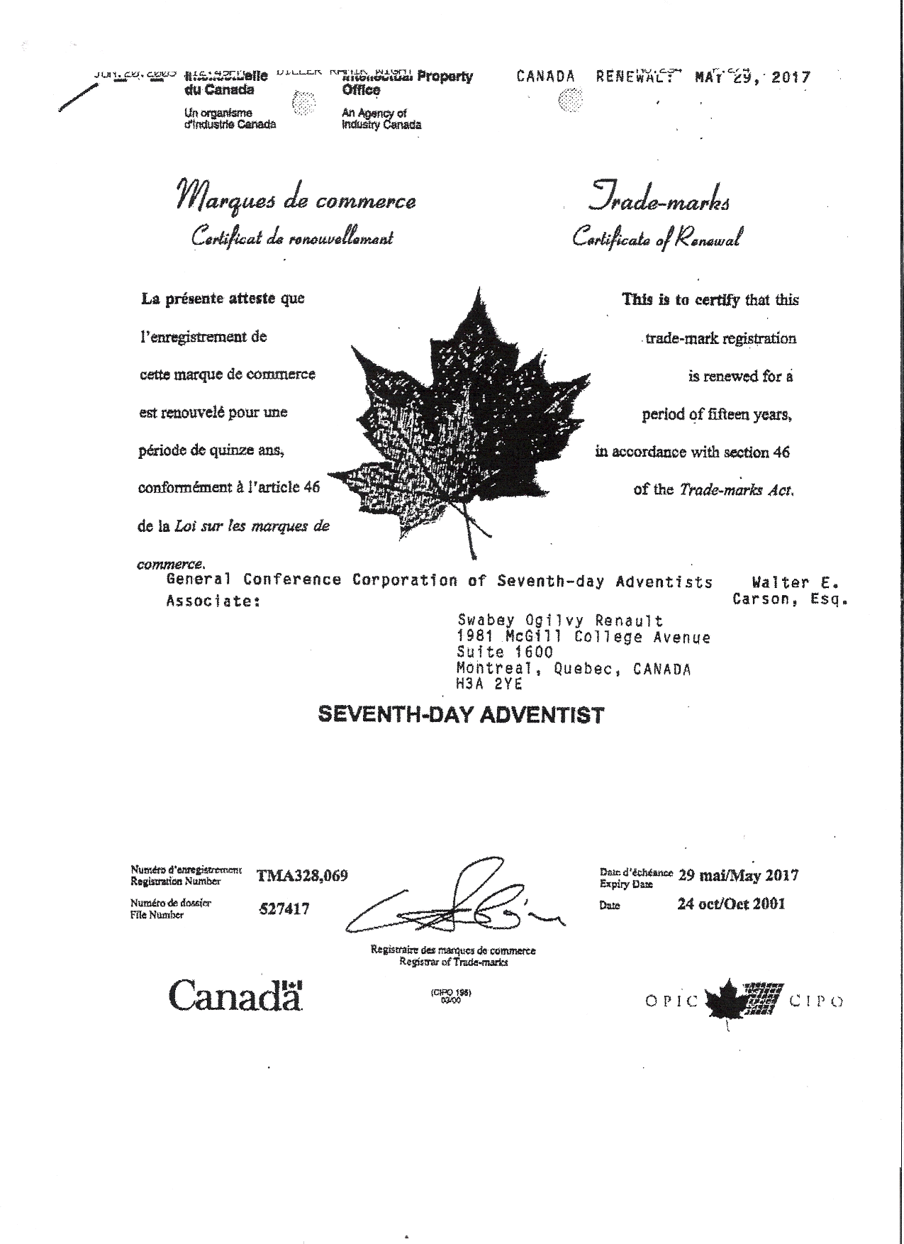 Actualizacion 10/10/06: La Conferencia General de ASD esta ahora amenazando al Pastor “Chick” con una carta de demanda relacionada a un nombre de dominio de nosotros, CSDA (ASDC), en Canadá. Ver a continuación las imágenes de la carta y los documentos de la marca registrada en Canadá: