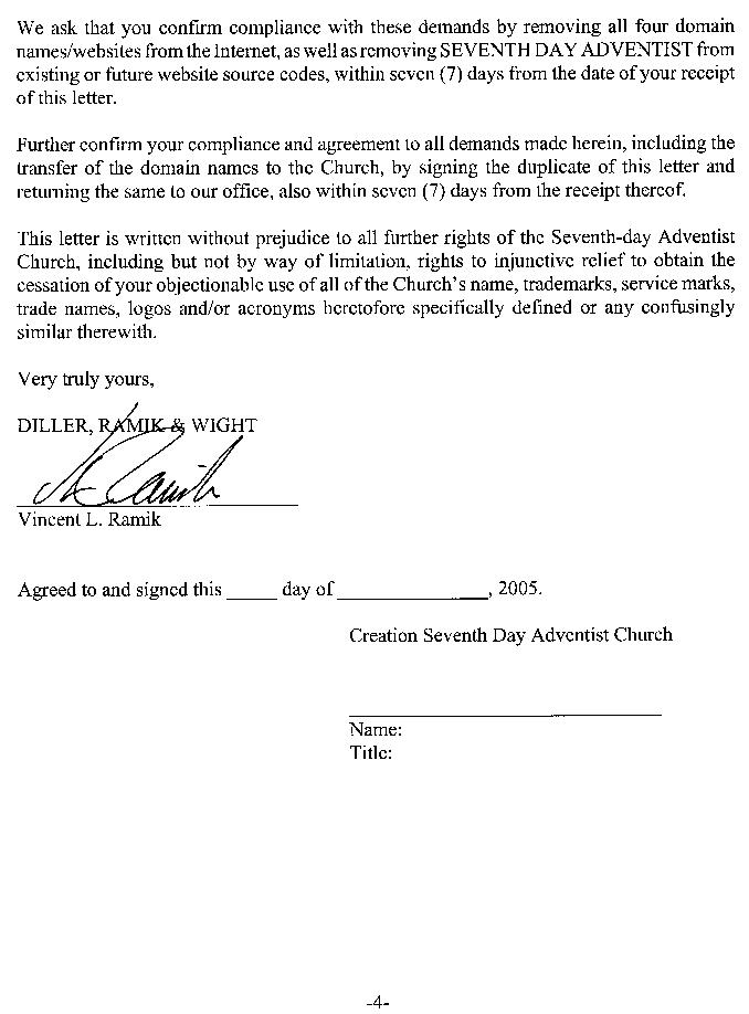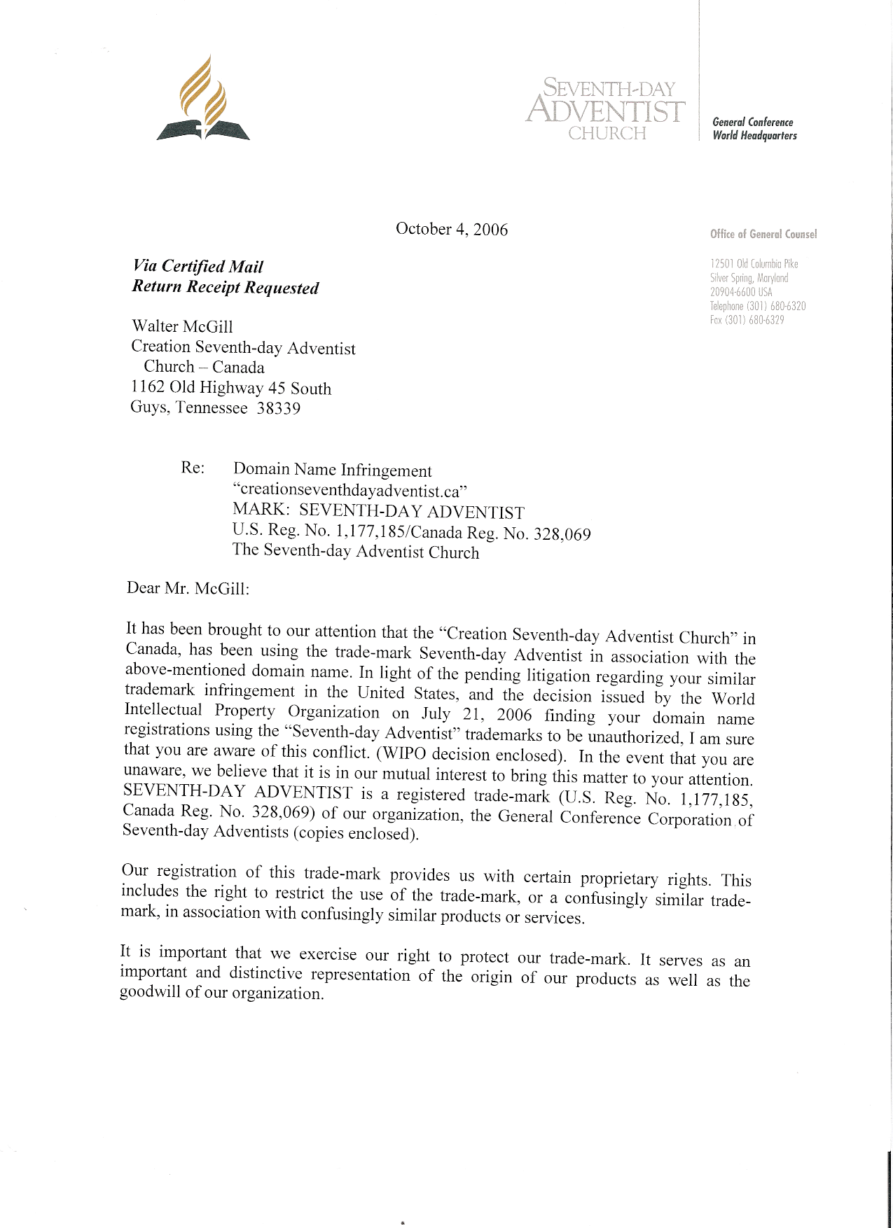 Actualizacion 05/27/06: Hemos recibido noticia de que la Corporación de la Conferencia General de ASD esta ahora amenazando nuestros nombres de dominio de Internet a nivel mundial. Pastor “ Chick” ha recibido una notificación por correo electrónico de que el Centro de Arbitraje y Mediación de la Organización Mundial de Propiedad Intelectual(OMPI) [World Intellectual Property Organization (WIPO)] ha recibido un reclamo de parte de la C.G contra varias de nuestras paginas web, esta peticion fue hecha en Mayo 23 de este año.