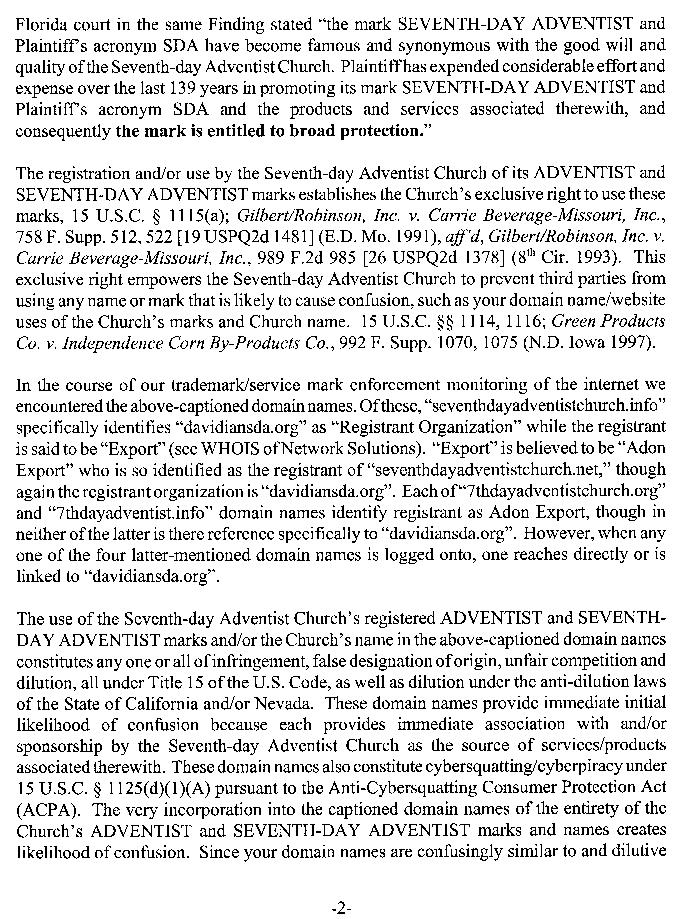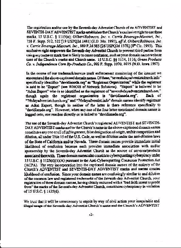 Carta de demanda al propietario de los nombres de dominio Davidianos ASD (Davidian SDA domain names): Pág1, Pág.2, Pág.3, Pág.4