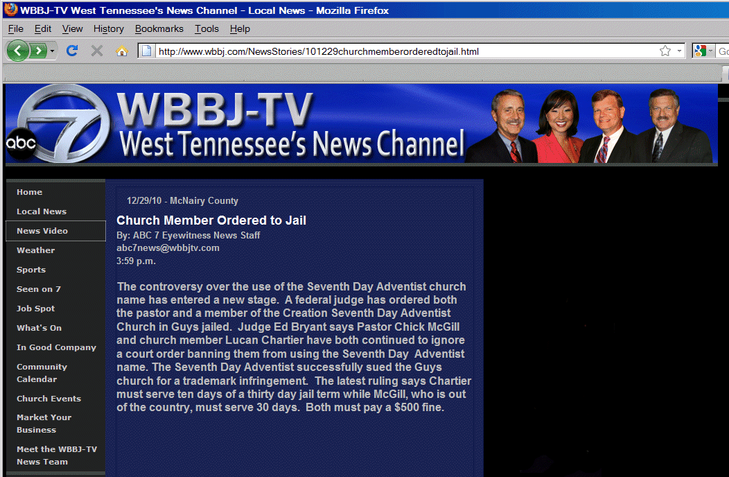 (Captura de Pantalla de la pagina de Noticias de Adventist Today)Noticias TV ABC, Canal 7 WBBJ Jackson, Tennessee