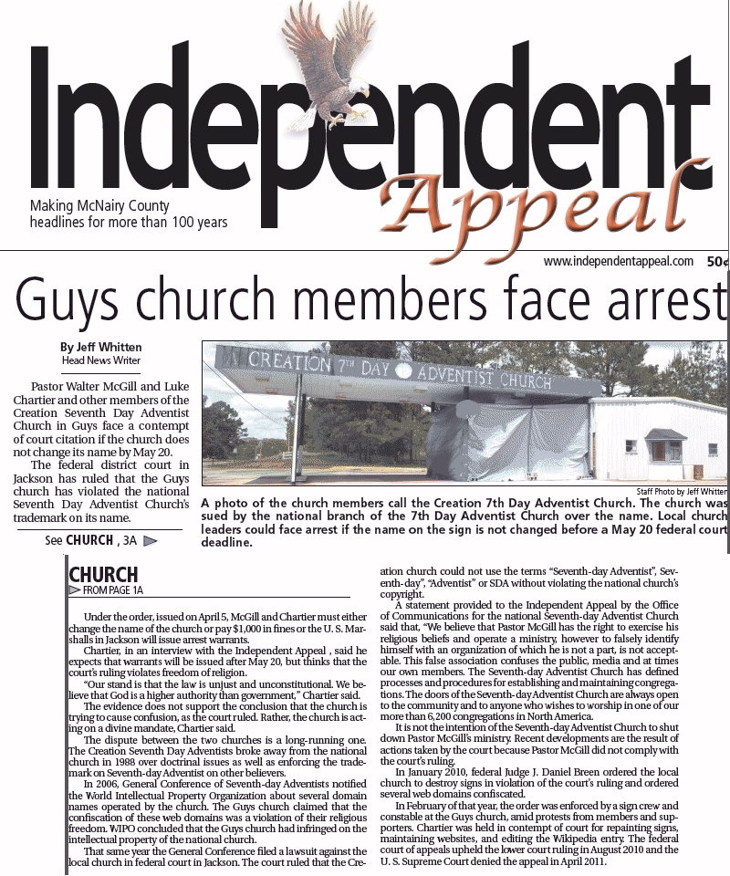 Actualizacion 2/16/10: Los abogados de la Conferencia General, acompañados por un Alguacil y un camarógrafo, llegan al establecimiento de la Iglesia CSDA (Adventista del 7mo dia de la Creación) con un carro-con-equipo para destruir los letreros de la iglesia. Los funcionarios también confiscaron diversos materiales religiosos, libros, y artículos bíblicos del edificio mientras que un pequeño grupo protestaba por una unión de Iglesia-Estado y contra la imposición de la ley civil de marcas comerciales en asuntos de fe y convicción religiosa. Durante el allanamiento, el audio testimonio del Dr. David Aguilar fue puesto a través de los altavoces, en la propiedad. El Canal de Noticias ABC News , el periódico The Daily Corinthian , y el periódico McNairy County News ofrecieron cobertura del evento, y un video de "algunos alzando sus manos para remover la pancarta (el testimonio) para oscurecer su significado puede verse aquí.